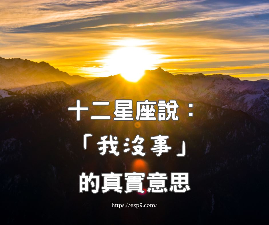 牡羊座說「我沒事」的真實意思:我沒事,但撐不住的時候你要救我 金牛座說「我沒事」的真實意思:我就算有事也不會說,會自己撐著 雙子座說「我沒事」的真實意思:不想要你管,你就別再問了 巨蟹座說「我沒事」的真實意思:不想要你擔心,但希望你會發現我有事 獅子座說「我沒事」的真實意思:再有事也都會說我沒事,不能被知道 處女座說「我沒事」的真實意思:現在還撐得住,真的不行會跟你說 天秤座說「我沒事」的真實意思:不要每次我說了你就相信我沒事 天蠍座說「我沒事」的真實意思:我不會承認我有事,但會看你能不能發現 射手座說「我沒事」的真實意思:我說沒事就是沒事,有事我會說 摩羯座說「我沒事」的真實意思:我會自己想辦法的 水瓶座說「我沒事」的真實意思:不想要再多個人來管我的事 雙魚座說「我沒事」的真實意思:其實我很有事啊