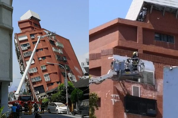 ▲馬國鳳提醒,後續可能有規模8強震,民眾要做好心理準備。圖為今天花蓮天王星大樓傾斜。(圖/翻攝畫面)